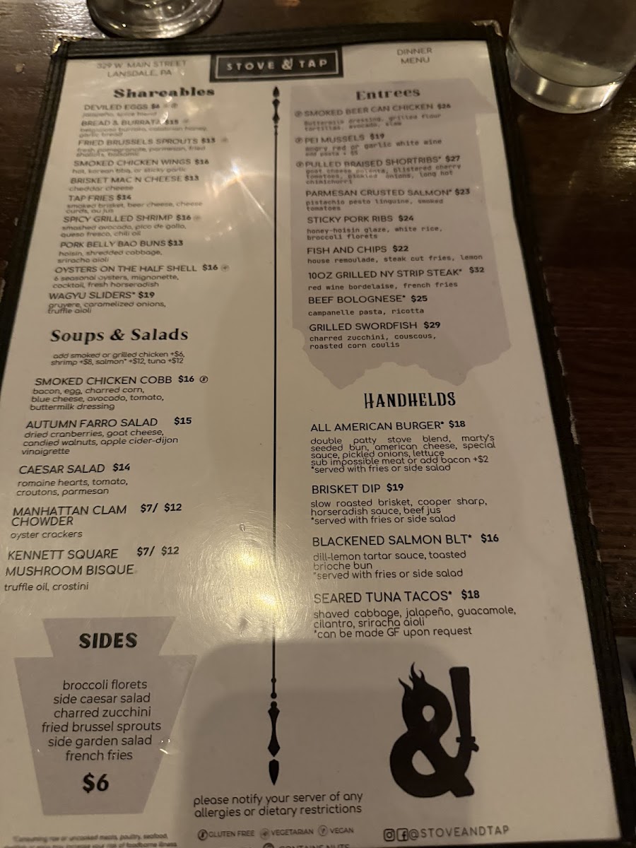 Visit 329 W Main St or call +1 215-393-8277 to explore the inviting menu and warm ambiance at Stove & Tap Lansdale.